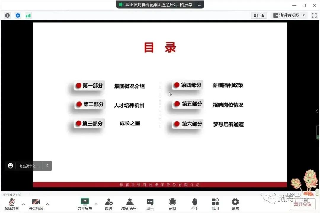 为深入学习贯彻党的二十大精神,落实党中央、国务院“稳就业”“保就业”决策部署,进一步做好公司2023届毕业生就业创业工作,解决员工就业问题,根据《英国365集团2023届毕业生校园招聘月系列活动方案》要求,2022年11月23日晚,公司联合通辽梅花生物科技有限公司于腾讯会议召开2023届毕业生线上宣讲会。会议由通辽梅花生物科技有限公司校招负责人李贺新主持,化学化工公司党总支副书记刘朋、团学办公室主任张一帆、2023届毕业生辅导员孟庆永及毕业生参加了会议。