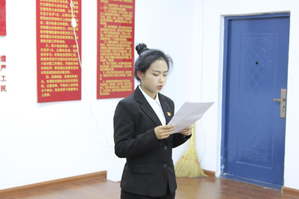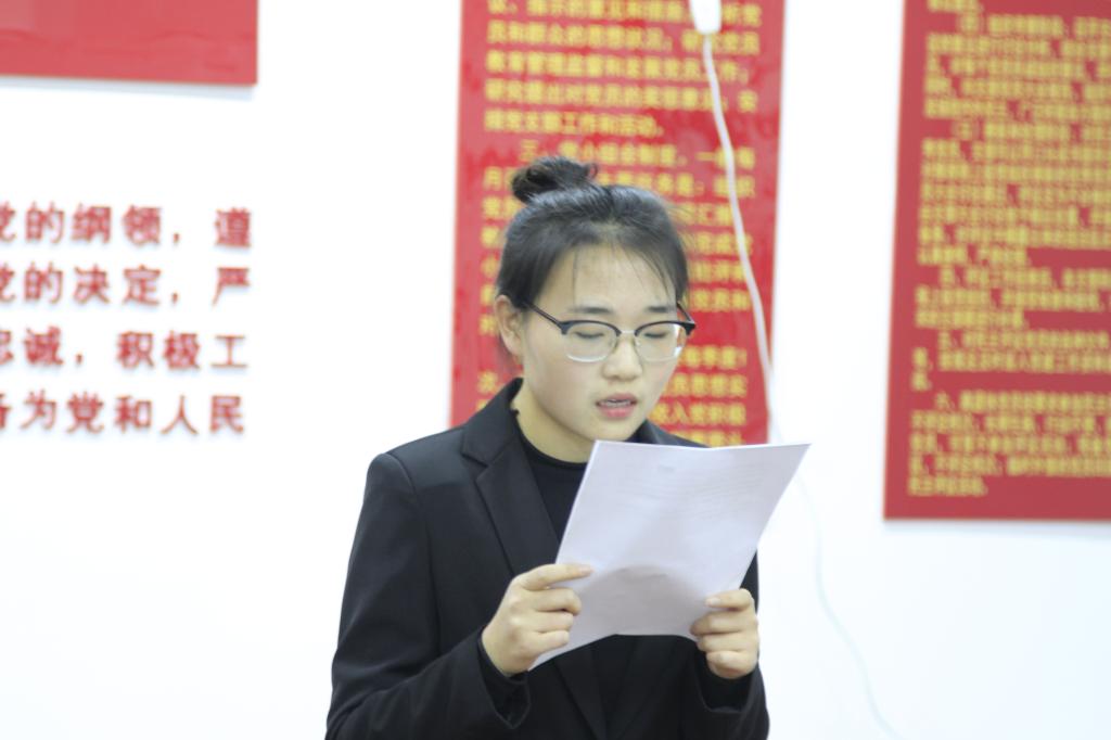 2018级化学班刘佳代表新党员发言。首先感谢各位领导、老师以及党员同志们对各位新党员长期以来的关心激励和帮助。同时代表新党员向党组织表决心如下:一是坚定信念,努力加强党性修养,不断增强党性观念,从思想上进一步入党,永远跟党走,牢记全心全意为人民服务的宗旨;二是认真学习专业知识,努力掌握科学文化,以科学文化知识武装自己头脑,提高思想境界和品德修为;三是认真履行党员的义务,以优秀党员为榜样,时时刻刻以党员先进性标准严格要求自己,努力发挥党员的先锋模范带头作用,积极努力地完成党交给我们的工作任务。在今后的学习、工作和生活中,所有党员将会继续用一名党员的标准严格要求自己,立足本职,无私奉献,永葆共产党员的先进性,用自己的实际行动践行今天的铮铮誓言。