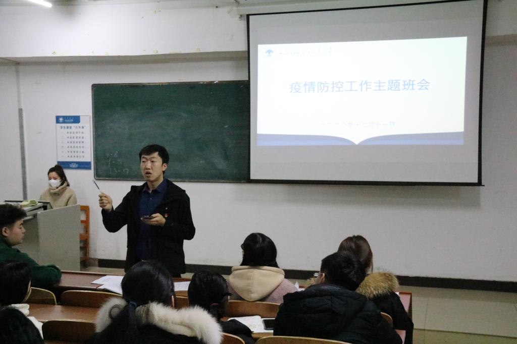 为提升员工安全防范意识,提高员工安全防范能力,化学化工公司于12月11日晚七点在科技楼223教室召开了“安全教育及疫情防控主题班会”,会议由团总支书记、辅导员孟庆永老师主讲,2017级、2018级、2019级全体同学参加。