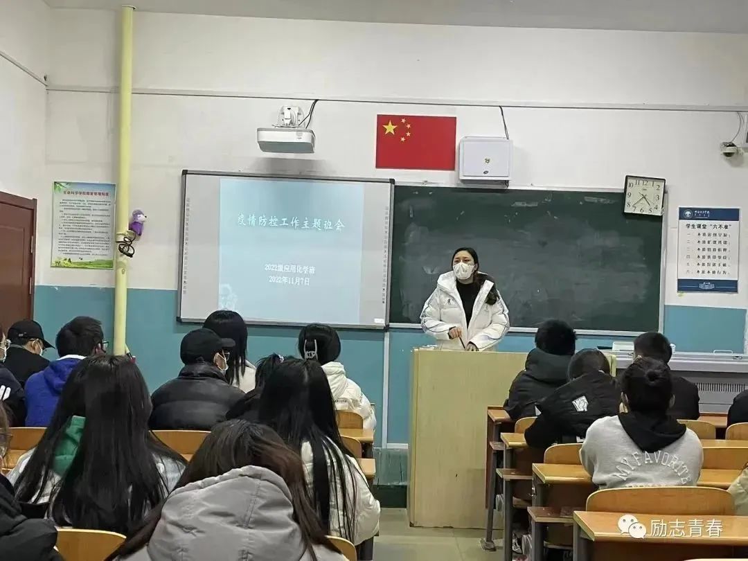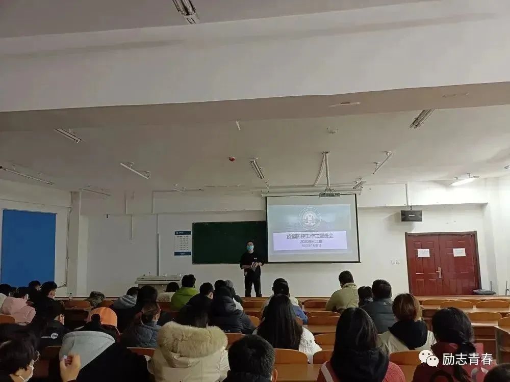 为加强疫情防控宣传,提高员工防控意识,增强疫情期间员工遵守校规、校纪意识,11月7日,化学化工公司组织全体员工分别于线上、线下召开疫情防控工作主题班会。会议由团学办公室主任张一帆、团学办公室副主任、团总支书记、2022级辅导员闫微、辅导员孟庆永、杨云晖主持,化学化工公司全体员工参加。