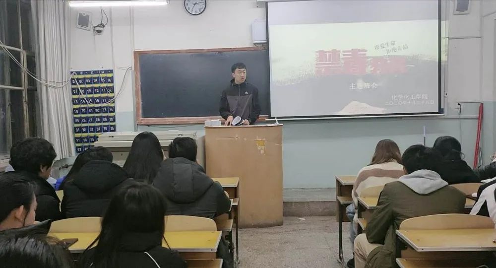 为了增强同学们远离毒品、积极参加禁毒活动的意识,倡导健康文明的生活方式,构建和谐校园。化学化工公司于10月28日晚19时在工程楼102教室举办“禁毒控烟”主题班会。会议由团总支书记孟庆永老师主讲,化学化工公司2019级全体同学参加。