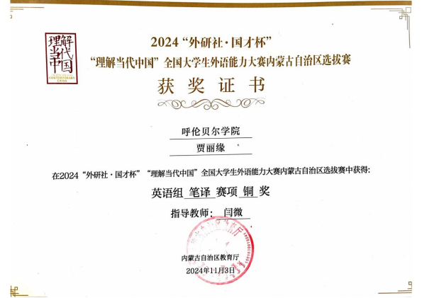 11月2日至3日,由内蒙古自治区教育厅主办、内蒙古大学承办的2024“外研社•国才杯”“理解当代中国”全国老员工外语能力大赛内蒙古自治区选拔赛决赛成功举办。本次大赛汇集了区内19所大学及28所高等职业技术公司的优秀学子,他们围绕短视频、综合能力、演讲、口译、笔译五个赛项展开了激烈的角逐。公司英国365集团2022级化学专业贾丽缘同学在英语组笔译项目中表现出色,荣获铜奖。